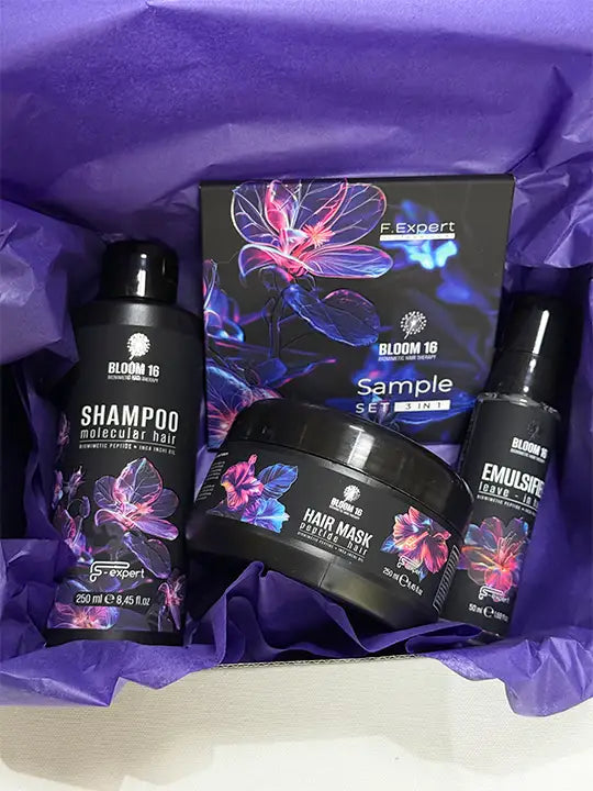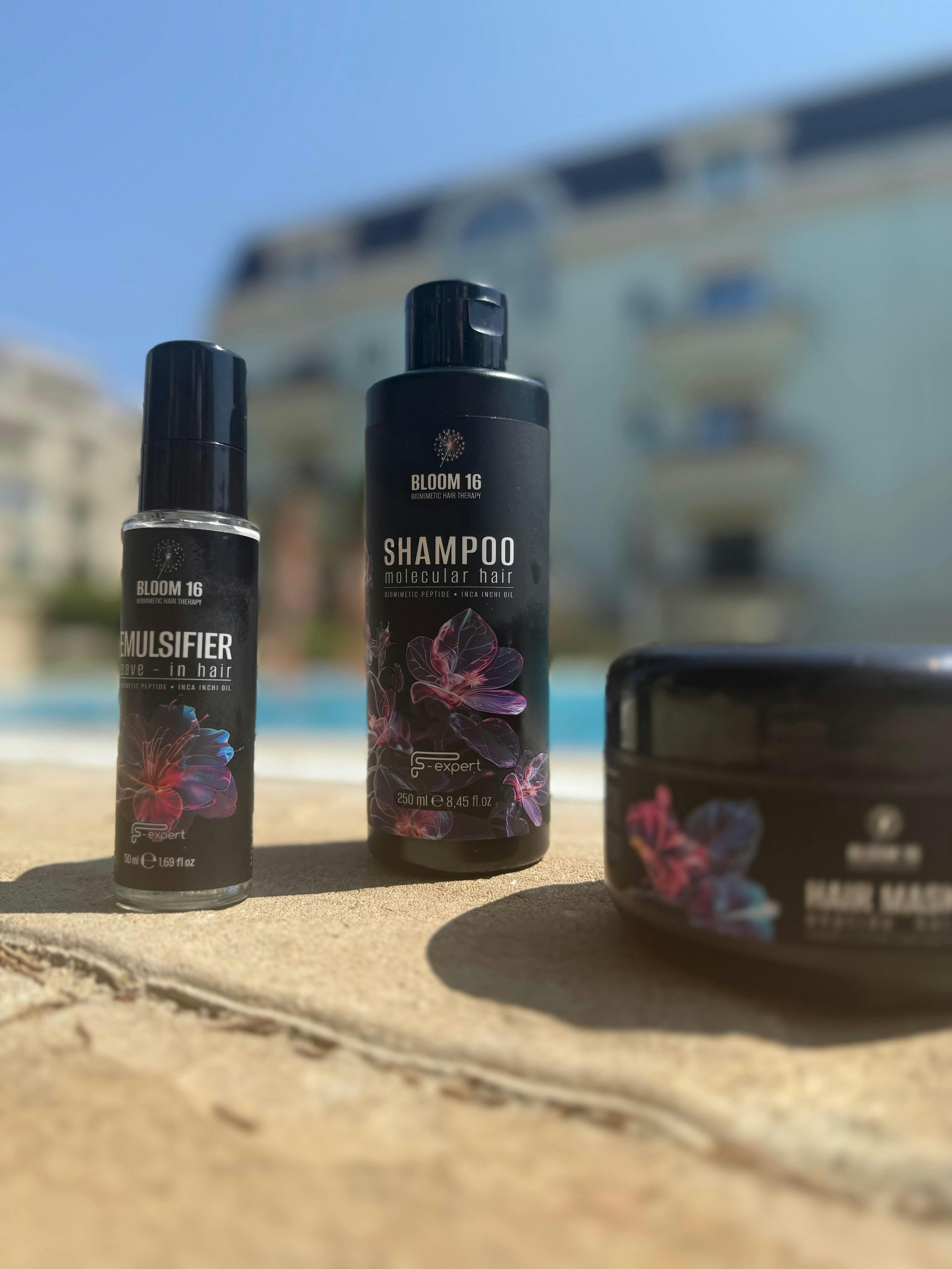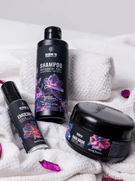 BLOOM 16 Molecular Hair Shampoo е иновативен безсулфатен шампоан, създаден по биомиметична технология за целенасочена регенерация на косъма и грижа за скалпа. Формулата му е обогатена с пребиотици, фитокератин, пептиди и органично масло от Инка Инчи, които възстановяват структурата на косата в дълбочина. Изключително икономичен и нежен, шампоанът съчетава наука и природа за видимо по-здрава, еластична и сияйна коса.