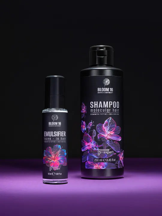 BLOOM 16 Molecular Hair Shampoo е иновативен безсулфатен шампоан, създаден по биомиметична технология за целенасочена регенерация на косъма и грижа за скалпа. Формулата му е обогатена с пребиотици, фитокератин, пептиди и органично масло от Инка Инчи, които възстановяват структурата на косата в дълбочина. Изключително икономичен и нежен, шампоанът съчетава наука и природа за видимо по-здрава, еластична и сияйна коса.