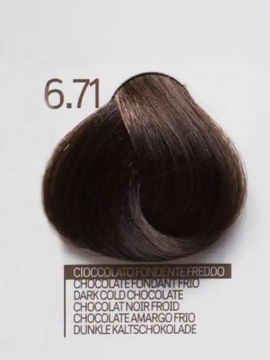 Цвят 6.71 тъмен студен шоколад за коса, стриктно показан върху образец.