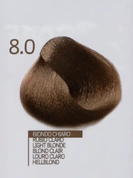 Цвят 8.0 Light Blonde – италианска крем-боя, представен в образец на коса.