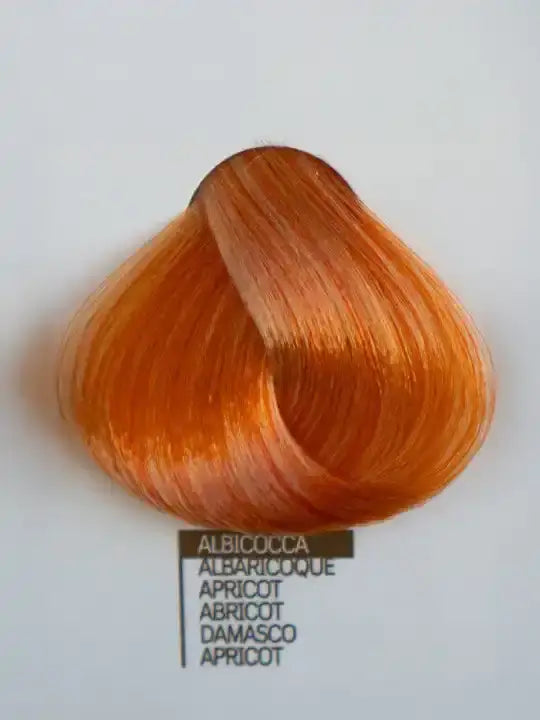 Примерна боя за коса в цвят кайсия, показваща наситеност и блясък на оцветените кичури.