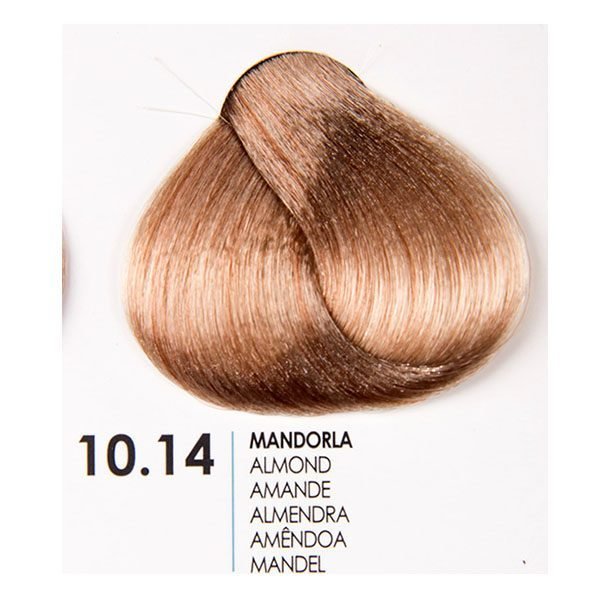 Fanola Brown 10.14 hair color swatch displaying a rich almond shade, showcasing smooth, shiny hair texture.
