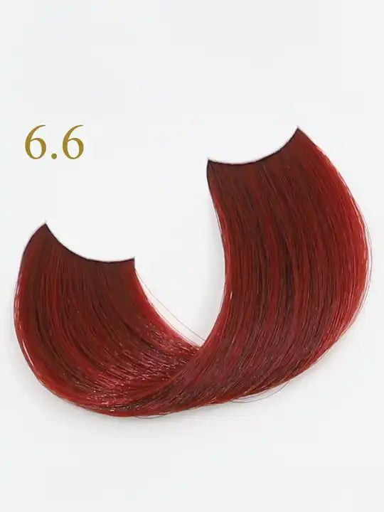 Цвят 6.6 Dark Blonde Red тестер за боя за коса Oro Therapy с блестяща текстура.